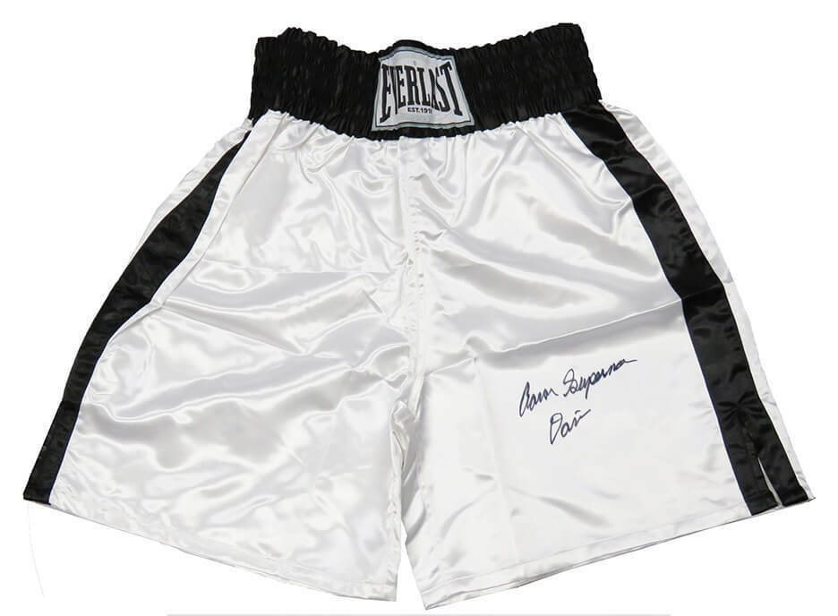 Aaron Davis signed Everlast white boxing trunks with 'Superman' inscription. Item comes with a Schwartz Sports Memorabilia tamper-proof numbered hologram and Certificate of Authenticity which can be verified online.