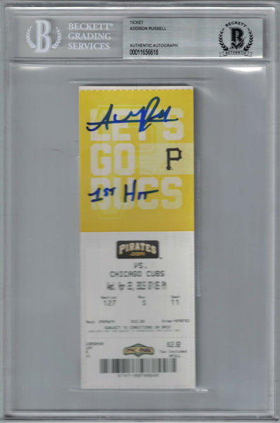 Addison Russell Autographed/Signed Chicago Cubs Ticket 1st Hit BAS Slab 25281 This is an official ticket from April 22nd 2015 between the Chicago Cubs and Pittsburgh Pirates that was personally autographed by Addison Russell with 1st Hit inscription. This is the exact item that you will receive so please see scans for condition. This has been slabbed by Beckett Grading Services (BAS) and includes a certificate of authenticity from Denver Autographs.