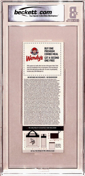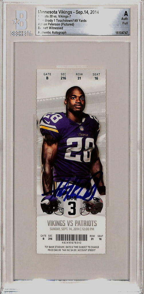 Adrian Peterson Signed Minnesota Vikings Ticket Stub 09/14/14 Becket Slab 43226 The number in the listing title is just an inventory sku for our records and is not the authentication number. The item pictured is a the exact item you will receive, please see photos for condition. This is a Minnesota Vikings Slabbed Ticket Stub 09/14/14 that was personally autographed by Adrian Peterson. Includes a certificate of authenticity from Beckett Authentication Services (BAS) and Denver Autographs.