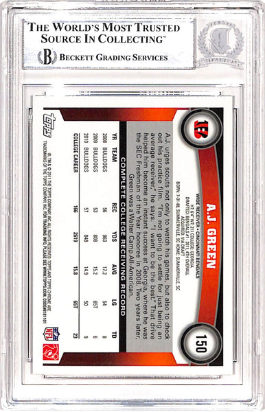 AJ Green Signed 2011 Topps Chrome #150 Trading Card Beckett 39074 The number in the listing title is just an inventory sku for our records and is not the authentication number. The item pictured is a stock photo unless otherwise noted. This is a slabbed 2011 Topps Chrome #150 Trading Card that was personally autographed by Aj Green. Includes a certificate of authenticity from Beckett Authentication Services (BAS) and Denver Autographs.