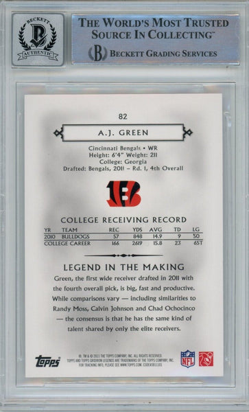 AJ Green Signed Bengals 2011 Topps Legends #82 Beckett Auto 10 40662 The number in the listing title is just an inventory sku for our records and is not the authentication number. This is a 2011 Topps Legends #82 trading card that was personally autographed by AJ Green. This was professionally authenticated and slabbed by Beckett Authentication Services (BAS), also includes a certificate of authenticity from Denver Autographs.