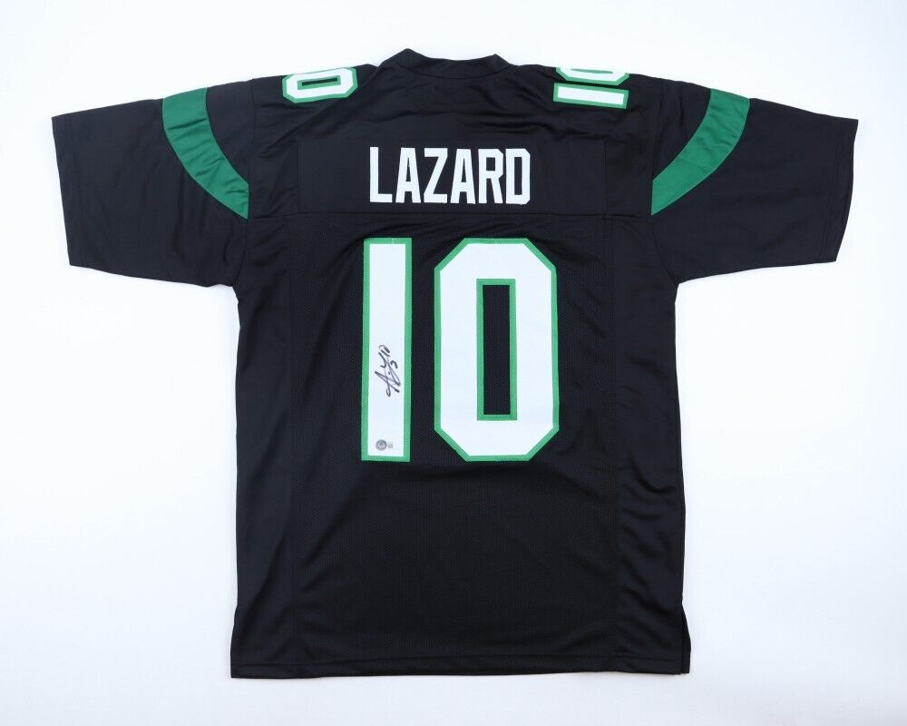 Allen Lazard, star wide receiver for the New York Jets, has hand signed this black custom jersey at a private signing. Jersey is size XL and all letters/numbers are sewn-on. This item is authenticated by Beckett Authentication Services and was signed in the presence of one of their representatives. Their tamper-evident hologram featuring a QR code and serial number is on the item. The authenticity can be verified online by entering the serial number or scanning the QR code. Item pictured may not be the exact item you will receive. It will be similar quality, and we guarantee your satisfaction.
