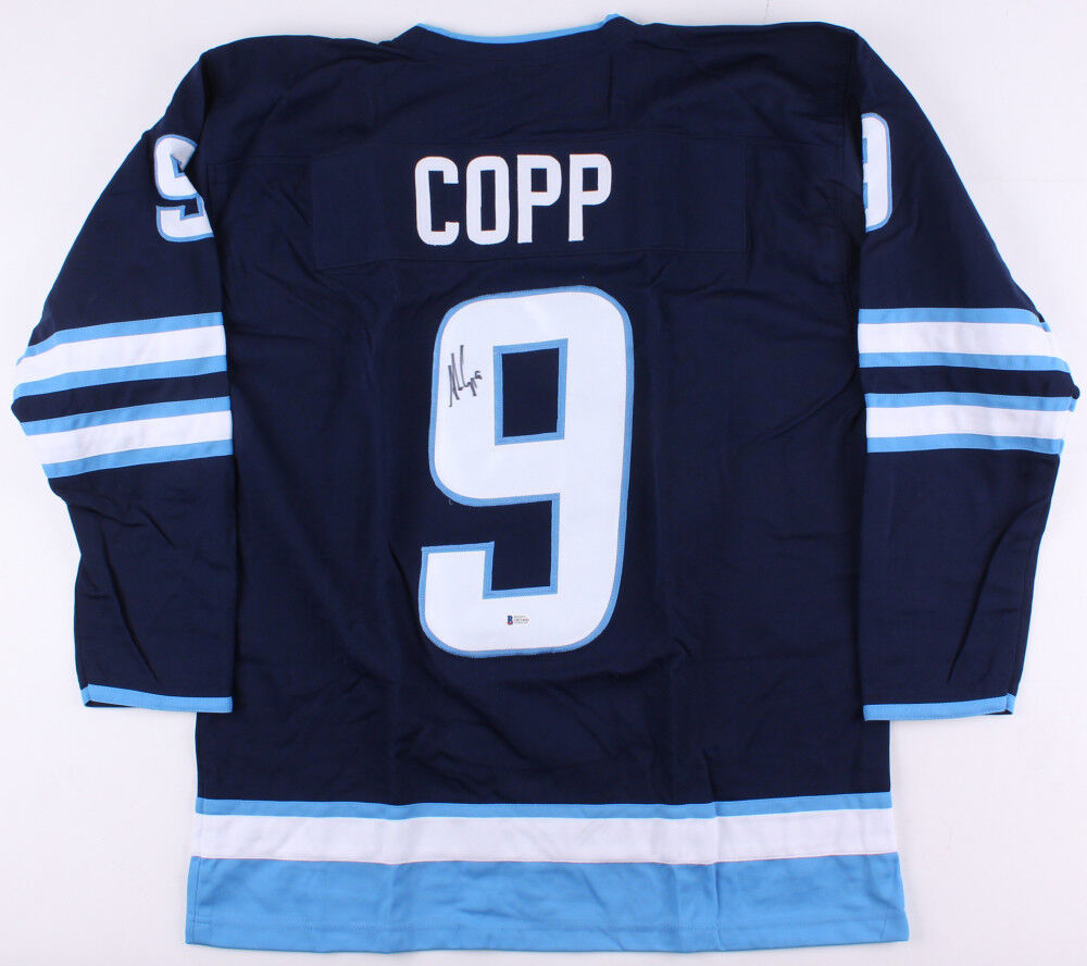 Custom on-ice style jersey. Everything is sewn on, size adult XL. Hand-signed in black felt-tip pen by Andrew Copp. The lot / autograph(s) includes an official Beckett Authentication Services serially numbered hologram and matching COA for authenticity purposes.Authentication: Beckett COA