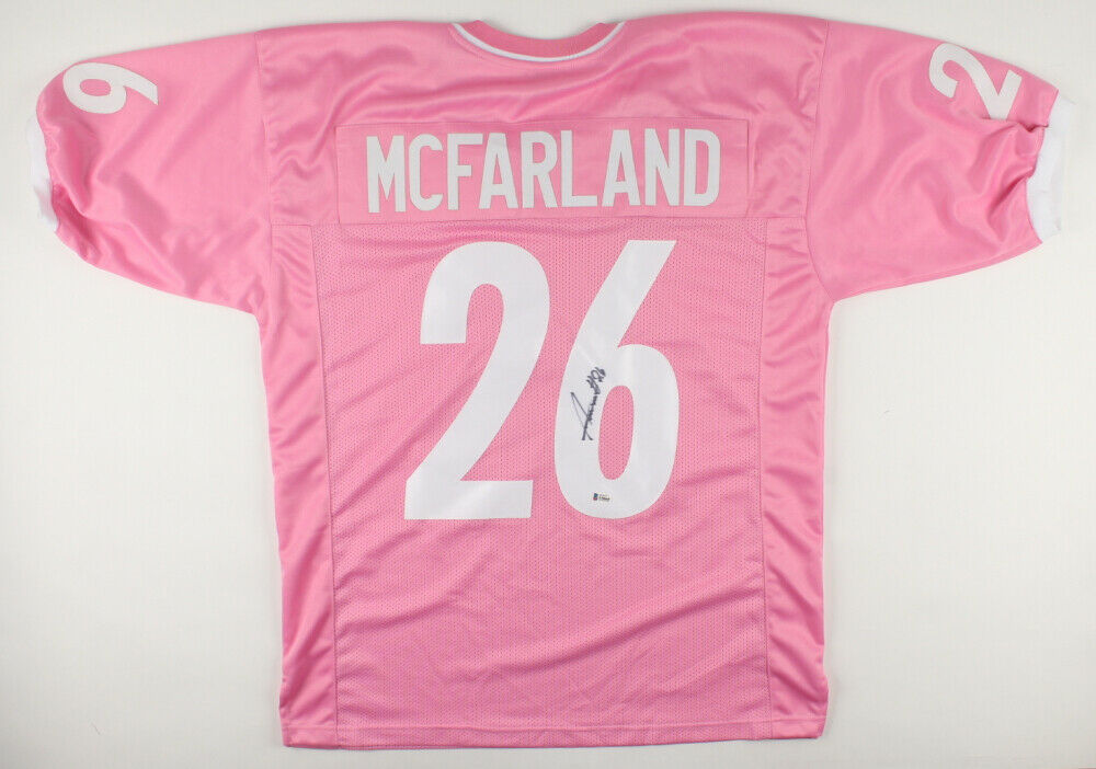 Custom on-field style jersey. Everything is sewn on, size XL. Hand-signed by Anthony McFarland.The lot / autograph(s) includes an official Beckett Authentication Services serially-numbered hologram for authenticity purposes.Authentication: Beckett Hologram