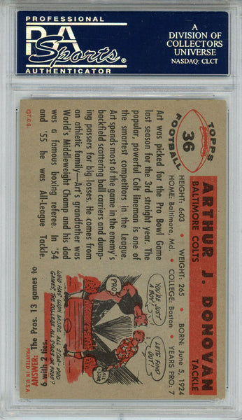 Art Donovan Signed 1956 Topps #36 Rookie Card w/HOF PSA Slab 42634 The number in the listing title is just an inventory sku for our records and is not the authentication number. This is the exact item that you will receive so please see pictures for condition. This is a trading card that has been personally autographed by Art Donovan. This has been professionally slabbed by Professional Sports Authentication (PSA) and includes a certificate of authenticity from Denver Autographs.