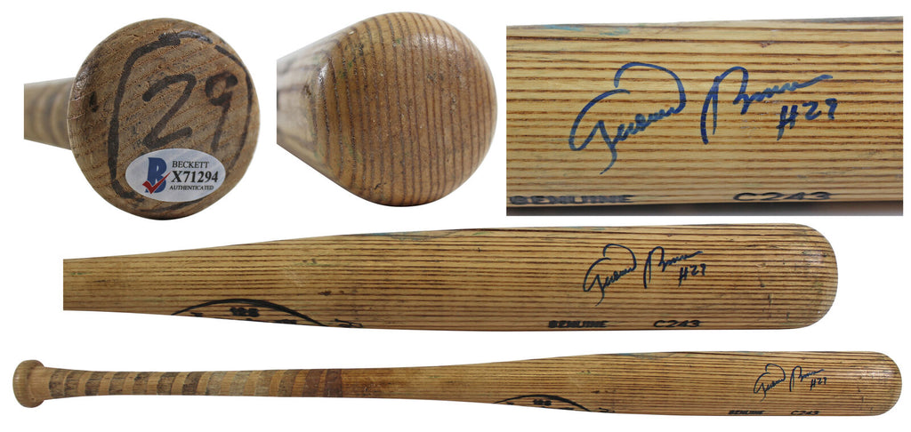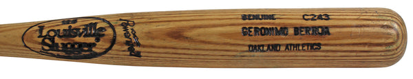 This Autographed Game Used Louisville Slugger C243 Player Model Baseball Bat has been Personally Signed by Geronimo Berroa of the Oakland Athletics. This item is 100% Authentic to include a Certificate of Authenticity (COA) / hologram by Beckett Authentication Services. The authenticity can be verified on Beckett Authentication Services website. There is no paperwork for the game use. We purchased from a former Oakland A's employee from that and the stamping and markings on the bat do lead us to believe this is in fact game used.