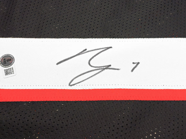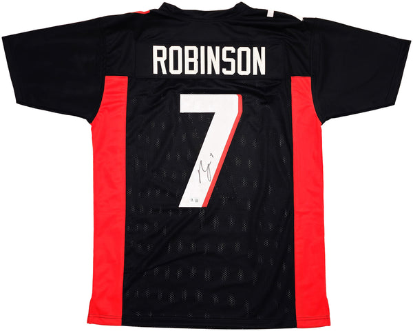 This is a Black Jersey that has been hand signed by Bijan Robinson. This is a custom jersey with no name brand. The approximate size is XL. It has nice sewn in name and numbers. This item has been witnessed and certified authentic by Beckett Authentication (BAS) and comes with their tamper-proof witness sticker.
