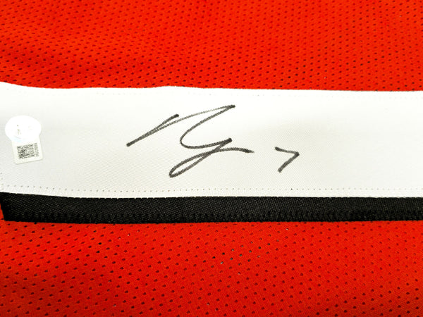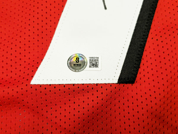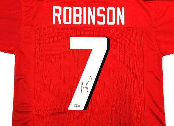 This is a Red Jersey that has been hand signed by Bijan Robinson. This is a custom jersey with no name brand. The approximate size is XL. It has nice sewn in name and numbers. This item has been witnessed and certified authentic by Beckett Authentication (BAS) and comes with their tamper-proof witness sticker.