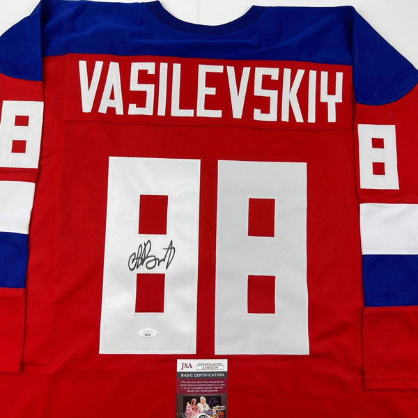 Autographed/Signed Andrei Vasilevskiy Team Russia Red Olympics Jersey JSA COA Jersey has no brand names or logos. This is a custom jersey and was not manufactured by or in any manner associated with any professional sports league or manufacturer. This custom jersey carries no professional sports league designation. The item is intended to be an autographed collectible. The custom jersey displays the name and number of the player. This item in no way is affiliated with or connected to any professional sports organization. Size is XL.