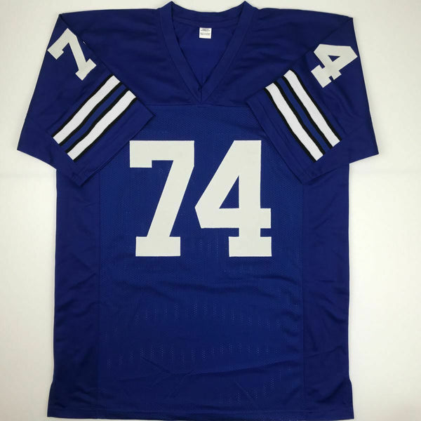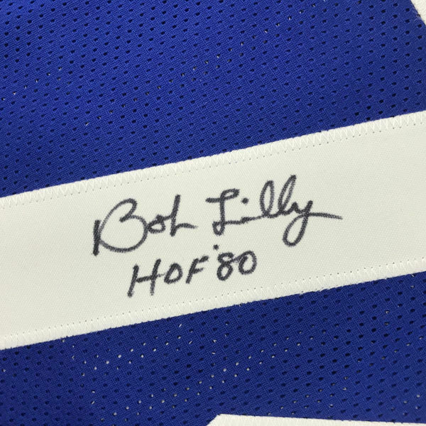 Autographed/Signed BOB LILLY HOF 80 Dallas Retro Blue Football Jersey JSA COA This is a custom jersey and was not manufactured by or in any manner associated with any professional sports league or manufacturer. This custom jersey carries no professional sports league designation. The item is intended to be an autographed collectible. Reference of team in the title is to allow the purchaser a point of association. The custom jersey displays the name, number and authenticated signature of the player. This item in no way is affiliated with or connected to any professional sports organization. The autograph, as always is guaranteed to be authentic and has been certified as authentic by a third-party, trusted authenticator. Size is XL unless otherwise noted.