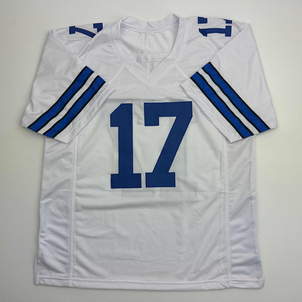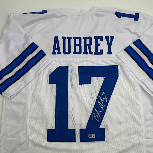 Autographed/Signed Brandon Aubrey Dallas White Football Jersey Beckett BAS COA Jersey has no brand names or logos. This is a custom jersey and was not manufactured by or in any manner associated with any professional sports league or manufacturer. This custom jersey carries no professional sports league designation. The item is intended to be an autographed collectible. The custom jersey displays the name and number of the player. This item in no way is affiliated with or connected to any professional sports organization. Size is XL.