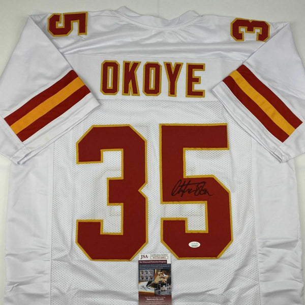 Autographed/Signed CHRISTIAN OKOYE Kansas City White Football Jersey JSA COA This is a custom jersey and was not manufactured by or in any manner associated with any professional sports league or manufacturer. This custom jersey carries no professional sports league designation. The item is intended to be an autographed collectible. Reference of team in the title is to allow the purchaser a point of association. The custom jersey displays the name, number and authenticated signature of the player. This item in no way is affiliated with or connected to any professional sports organization. The autograph, as always is guaranteed to be authentic and has been certified as authentic by a third-party, trusted authenticator. Size is XL unless otherwise noted.
