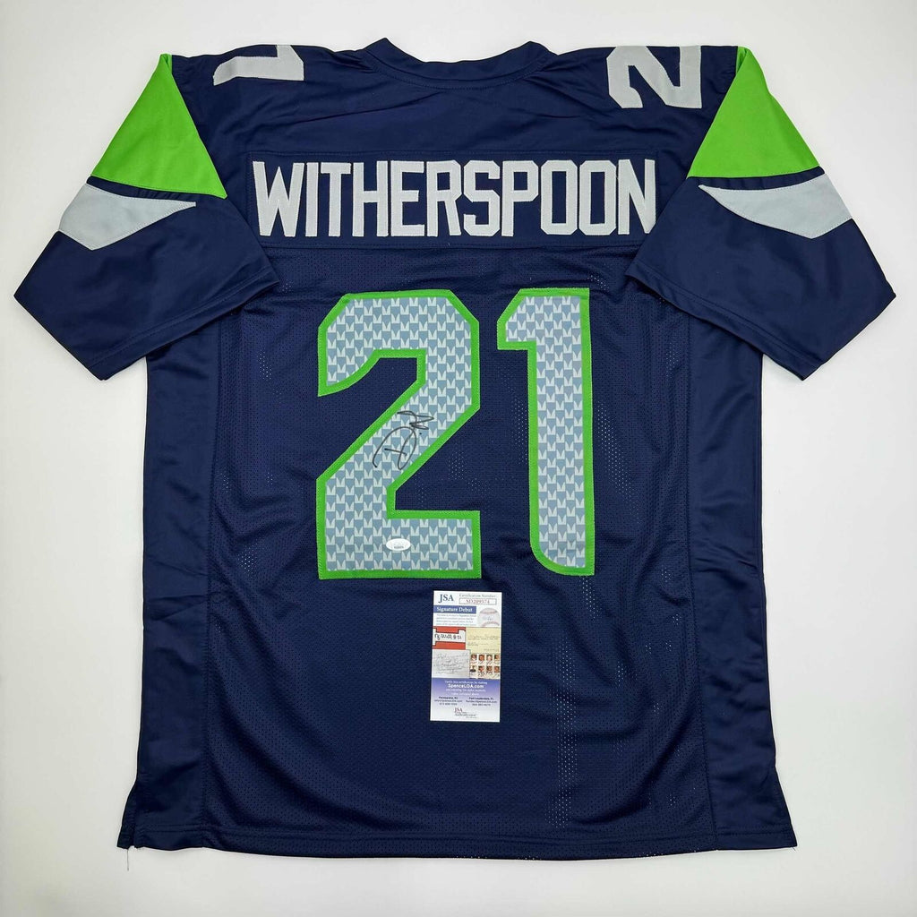 Autographed/Signed Devon Witherspoon Seattle Blue Football Jersey JSA COA Jersey has no brand names or logos. This is a custom jersey and was not manufactured by or in any manner associated with any professional sports league or manufacturer. This custom jersey carries no professional sports league designation. The item is intended to be an autographed collectible. The custom jersey displays the name and number of the player. This item in no way is affiliated with or connected to any professional sports organization. Size is XL.
