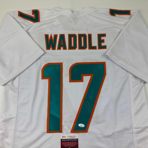 Autographed/Signed Jaylen Waddle Miami White Football Jersey JSA COA Jersey has no brand names or logos. This is a custom jersey and was not manufactured by or in any manner associated with any professional sports league or manufacturer. This custom jersey carries no professional sports league designation. The item is intended to be an autographed collectible. The custom jersey displays the name and number of the player. This item in no way is affiliated with or connected to any professional sports organization. Size is XL.
