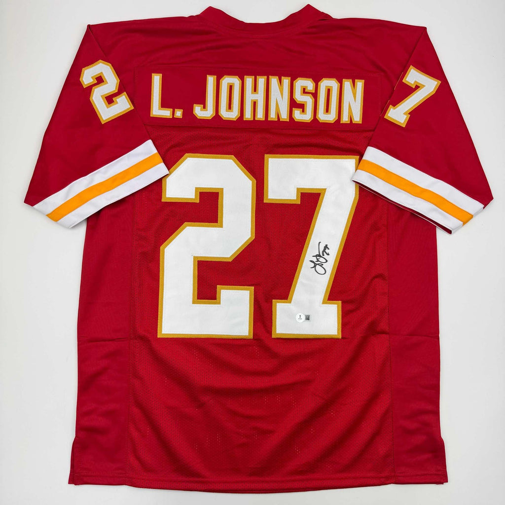 Autographed/Signed Larry Johnson Kansas City Red Football Jersey Beckett BAS COA Jersey has no brand names or logos. This is a custom jersey and was not manufactured by or in any manner associated with any professional sports league or manufacturer. This custom jersey carries no professional sports league designation. The item is intended to be an autographed collectible. The custom jersey displays the name and number of the player. This item in no way is affiliated with or connected to any professional sports organization. Size is XL