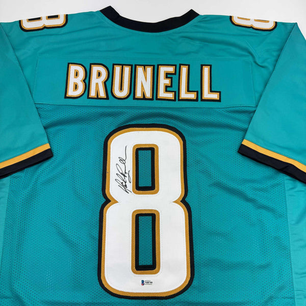 Autographed/Signed Mark Brunell Jacksonville Teal Jersey Beckett BAS COA Jersey has no brand names or logos. This is a custom jersey and was not manufactured by or in any manner associated with any professional sports league or manufacturer. This custom jersey carries no professional sports league designation. The item is intended to be an autographed collectible. The custom jersey displays the name and number of the player. This item in no way is affiliated with or connected to any professional sports organization. Size is XL.