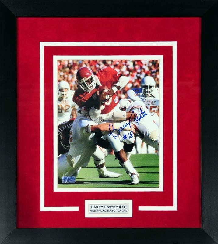 Barry Foster, former star running back for the Arkansas Razorbacks, has hand signed this 8x10 photo at a private signing. It comes professionally framed in a black wood frame and double matted in Arkansas colors. This item comes with a certificate of authenticity (COA) from Signature Sports Marketing, one of the leaders in the industry. You will receive a paper COA along with matching serial-numbered holograms.Item pictured may not be the exact item you will receive. It will be similar quality, and we guarantee your satisfaction.