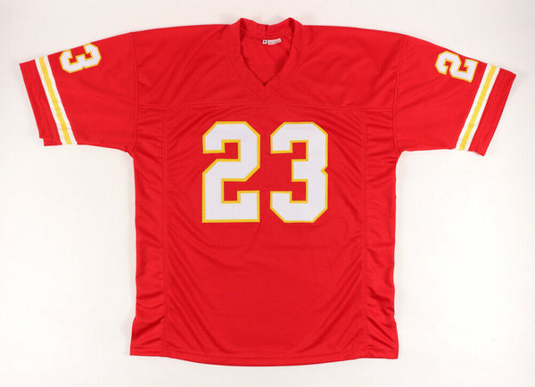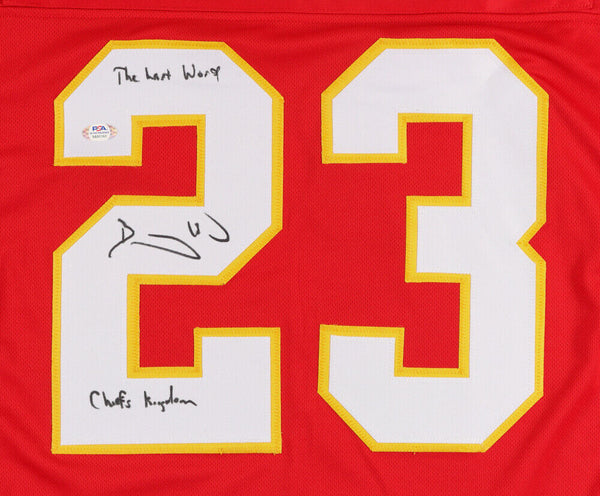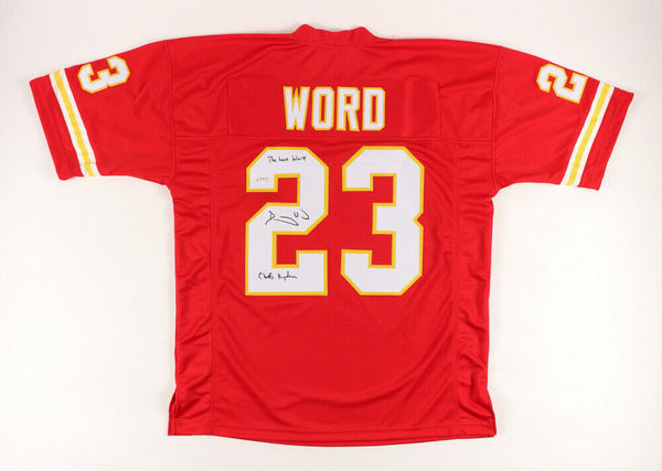 Custom on-field style jersey. Everything is sewn on, size XL. Has been hand-signed and inscribed "The Last Word" & "Chiefs Kingdom" by Barry Word.The lot / autograph(s) includes an official PSA/DNA hologram and matching COA for authenticity purposes. The signing of this item was witnessed by PSA.Authentication: PSA COA