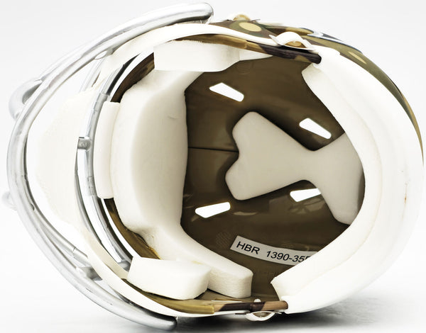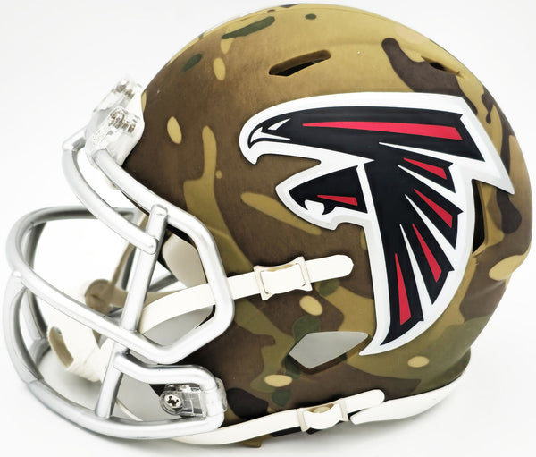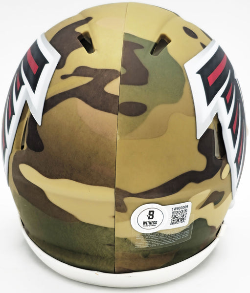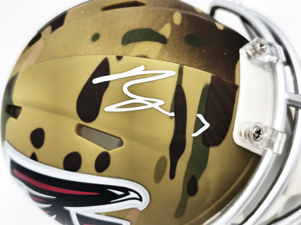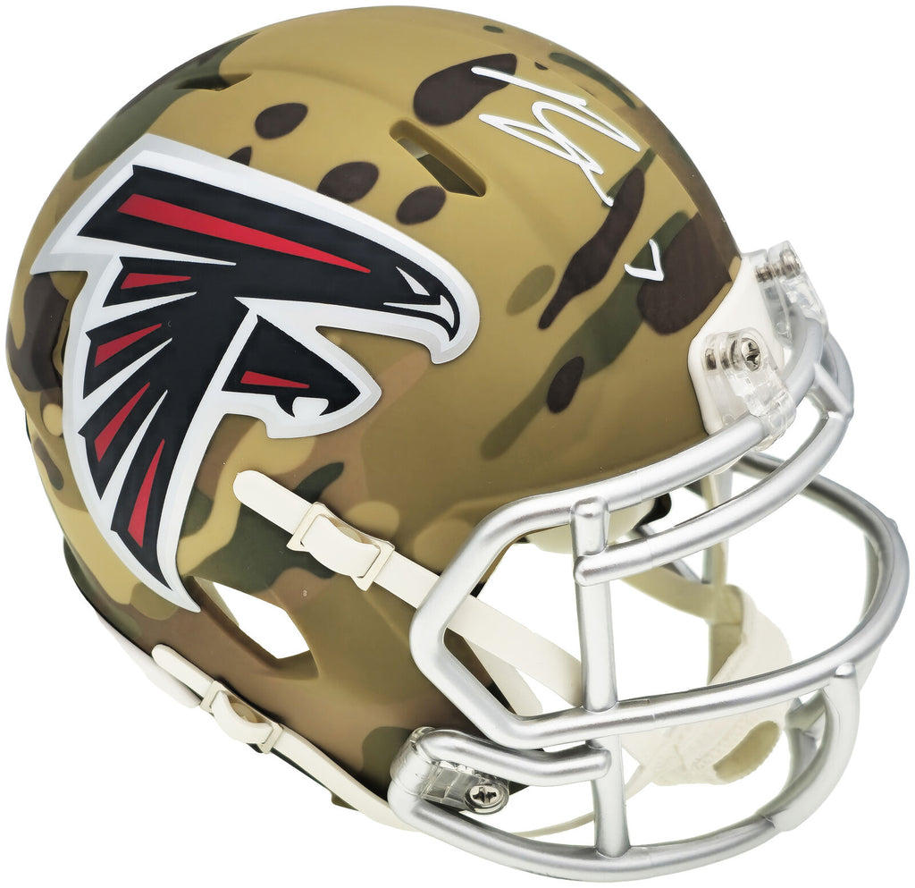 This is an Atlanta Falcons Camo Speed Mini Helmet that has been hand signed by Bijan Robinson. Because each Camo helmet is hand-dipped using water-transfer technology there may be slight imperfections. This item has been witnessed and certified authentic by Beckett Authentication (BAS) and comes with their tamper-proof witness sticker.