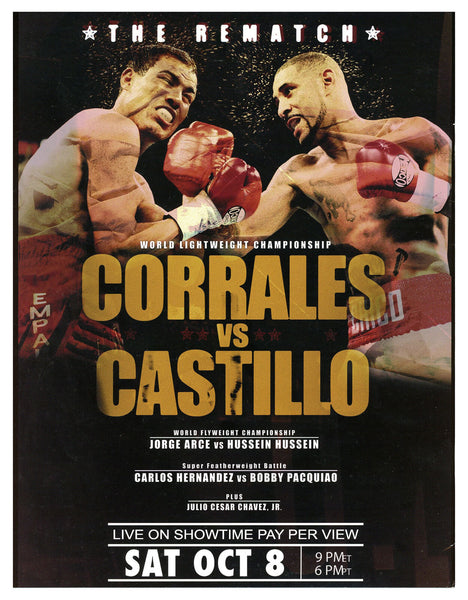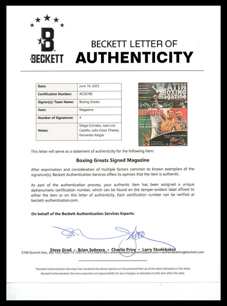 This is a Latin Boxing magazine that has been hand signed by Diego Corrales, Jose Luis Castillo, Julio Cesar Chavez & Fernando Vargas. This item has been certified authentic by Beckett Authentication (BAS) and comes with their Tamper-Proof Hologram and matching full-page certificate of authenticity.