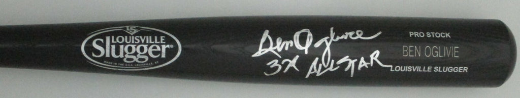 A Louisville Slugger Name ENGRAVED autographed Bat by Milwaukee Brewers legend and fan favorite BEN OGLIVIE. Signature is in Silver Paint Pen with the inscription "3 x All Star". This would make a great addition to any BREWERS collection! This item was signed during a public signing with us and is guaranteed to be 100% authentic. It will include a COA from JSA authentication.