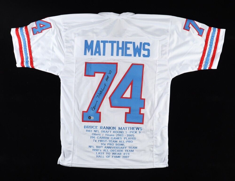 Custom jersey. Everything is sewn on, size XL. Hand-signed and inscribed by Bruce Matthews (HOF). Matthews' career stats have been sewn on the back under the reverse numbers.The lot / autograph(s) includes an official Beckett Authentication Services serially numbered hologram for authenticity purposes. The signing of this item was witnessed by Beckett.Authentication: Beckett Hologram