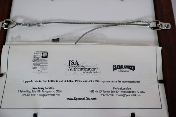 The product is a framed Carl Yastrzemski autographed postcard with authentication from James Spence Authentication (JSA). The sports memorabilia features the baseball player's signature, making it a valuable collectible for fans of the Boston Red Sox. This original autographed postcard is a unique and rare item that showcases Yastrzemski's connection to the team and the sport of baseball.