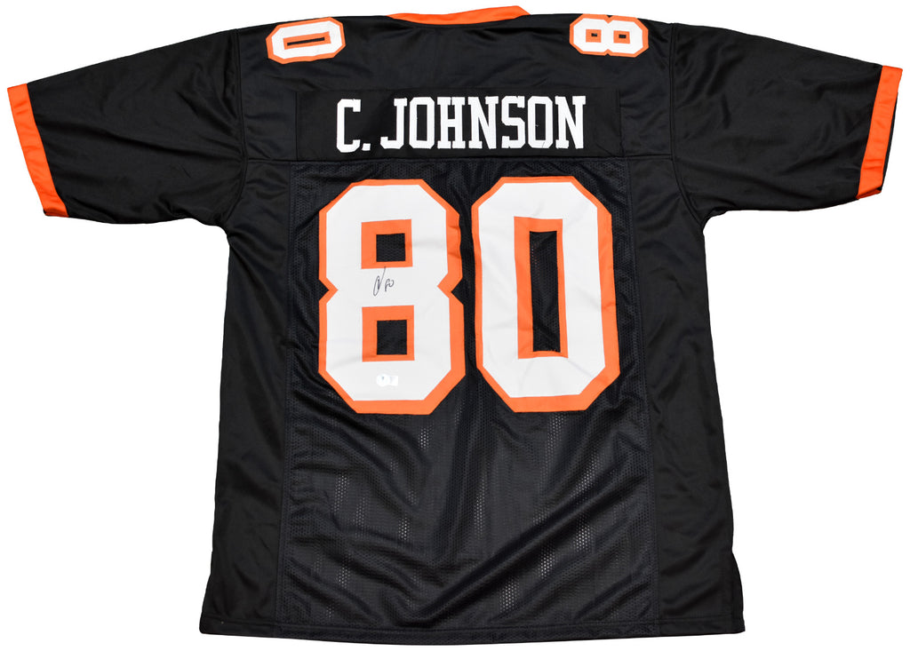 Chad Johnson, former star wide receiver for the Oregon State Beavers, has hand signed this black custom jersey at a private signing. Jersey is size XL and all letters/numbers are sewn-on. This item is authenticated by Beckett Authentication Services and was signed in the presence of one of their representatives. Their tamper-evident hologram featuring a QR code and serial number is on the item. The authenticity can be verified online by entering the serial number or scanning the QR code.Item pictured may not be the exact item you will receive. It will be similar quality, and we guarantee your satisfaction.