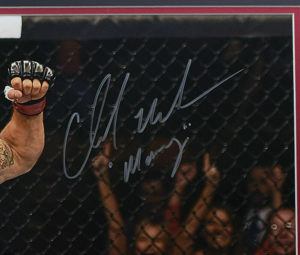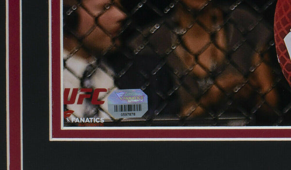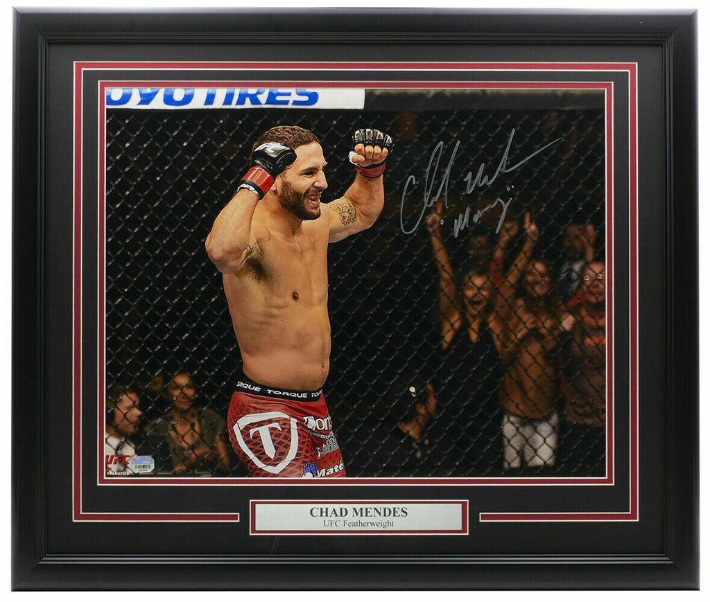 Featured is a Chad Mendes signed framed 16x20 UFC photo, in which he added the "Money" inscription. This photo was hand signed by Chad Mendes and authenticated by Fanatics authentication services. Included with the photo is a Fanatics hologram and certificate of authentication. Brand new professional framing featuring double matting and an engraved nameplate. The frame measures approximately 27x22 in total size. The frame is ready for display. SPECIFICATIONS Autographed By: Chad Mendes Team: Sport: Boxing Authentication: Fanatics Authentic
