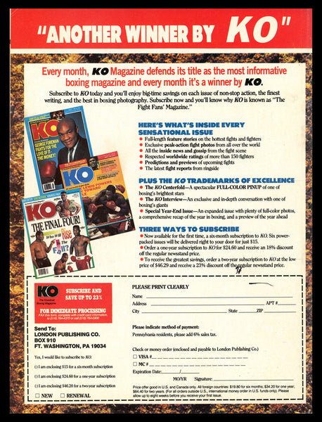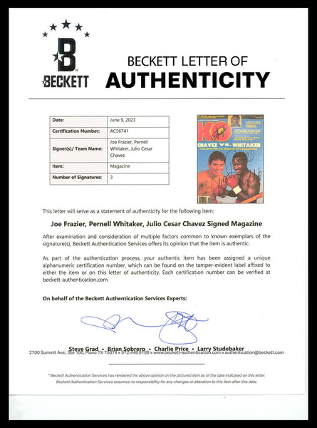 This is a KO magazine that has been hand signed by Julio Cesar Chavez, Joe Frazier & Pernell Whitaker. There is a smudge in the signature as shown. This item has been certified authentic by Beckett Authentication (BAS) and comes with their Tamper-Proof Hologram and matching full-page certificate of authenticity.