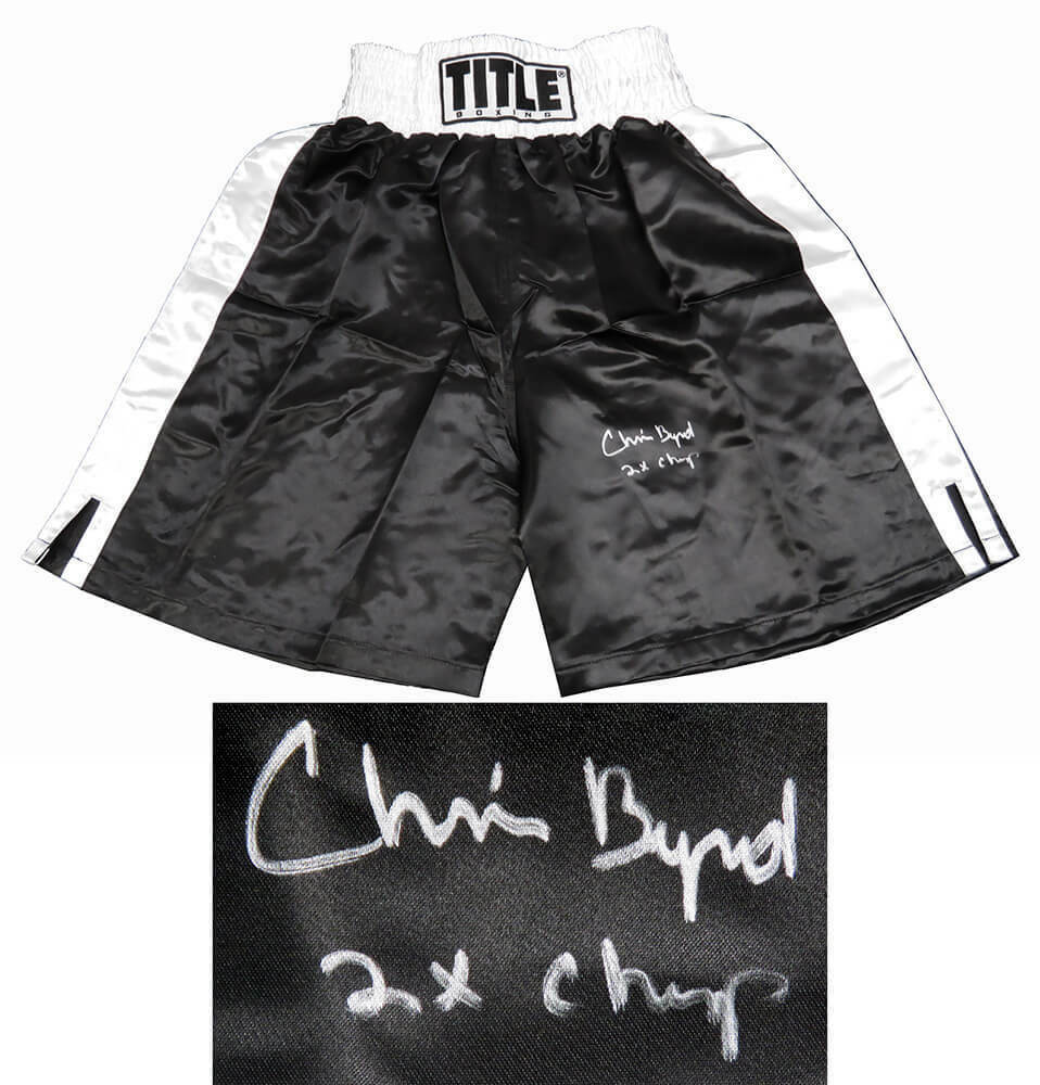 Chris Byrd signed Title black boxing trunks with '2x Champ' inscription. Item comes with a Schwartz Sports Memorabilia tamper-proof numbered hologram and Certificate of Authenticity which can be verified online.