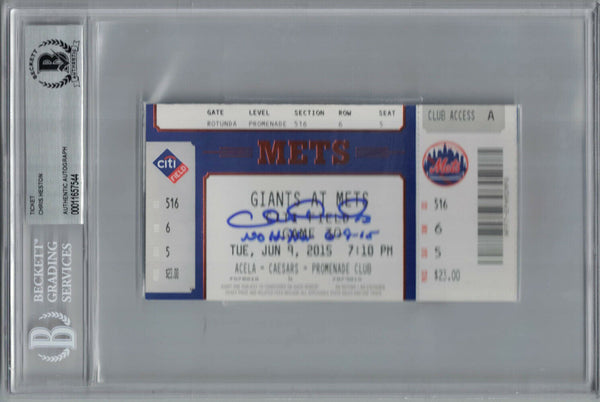 Chris Heston Signed San Francisco Giants Club Level Ticket No Hitter BAS 25261 This is an official club level ticket from June 9th 2015 between the New York Mets and San Francisco Giants that was personally autographed by Chris Heston with No Hitter 6-9-15 inscription. This is the exact item that you will receive so please see scans for condition. This has been slabbed by Beckett Grading Services (BAS) and includes a certificate of authenticity from Denver Autographs.