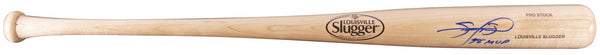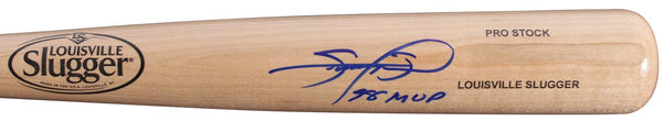 This Autographed Blonde Louisville Slugger Pro Stock Baseball Bat with the inscription of "98 MVP" has been Personally Signed by Sammy Sosa of the Chicago Cubs. This item is 100% Authentic to include a hologram by Beckett Authentication Services. This item will come with an affixed Beckett Authentication Services (BAS) authentication sticker, which includes a scannable QR code to verify authenticity. Please note that Beckett no longer provides serial-numbered COA cards, and the attached BAS sticker will serve as the complete authentication for this item. We conducted an autograph signing with Sammy Sosa where multiples of the same item were signed. While the photographs are representative of this item, the size, placement and strength of the signature may vary. Each item is hand signed, therefore, each autograph is unique. This item can be verified through BAS.