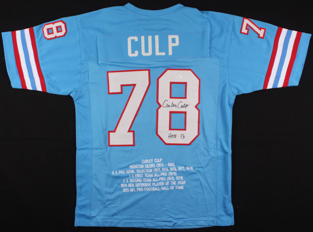 Custom on-field style jersey. Everything is sewn on, size XL. Hand-signed and inscribed in black felt-tip pen by Curley Culp (Died 2021, Denver Broncos, Kansas City Chiefs, Houston Oilers, Detroit Lions, HOF). Culp's career highlights are custom stitched below the numbers on the back side of the jersey. The lot / autograph(s) includes an official James Spence Authentication (JSA) hologram and matching COA for authenticity purposes. The signing of this item was witnessed by JSA.Authentication: JSA COA