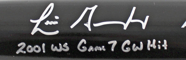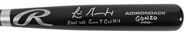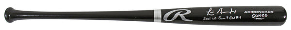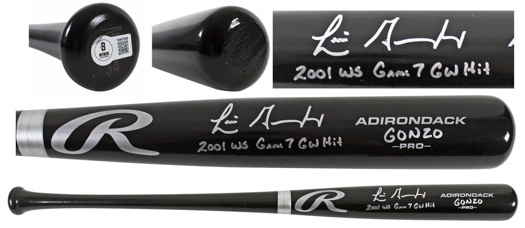 This Autographed Black Rawlings Adirondack Baseball Bat with the inscription of "2001 WS Game 7 GW Hit, Gonzo" has been Personally Signed by Luis Gonzalez of the Arizona Diamondbacks. This item is 100% Authentic to include a hologram by Beckett Authentication Services. This item will come with an affixed Beckett Authentication Services (BAS) authentication sticker, which includes a scannable QR code to verify authenticity. Please note that Beckett no longer provides serial-numbered COA cards, and the attached BAS sticker will serve as the complete authentication for this item. This is a BAS Witnessed Protection Program item which means a Beckett Authentication Service representative was present when this item was being signed. We conducted an autograph signing with Luis Gonzalez where multiples of the same item were signed. While the photographs are representative of this item, the size, placement and strength of the signature may vary. Each item is hand signed, therefore, each autograph is unique. This item can be verified through BAS Witnessed.