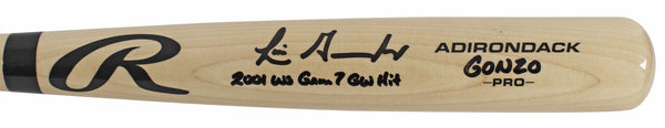 This Autographed Blonde Rawlings Adirondack Baseball Bat with the inscription of "2001 WS Game 7 GW Hit, Gonzo" has been Personally Signed by Luis Gonzalez of the Arizona Diamondbacks. This item is 100% Authentic to include a hologram by Beckett Authentication Services. This item will come with an affixed Beckett Authentication Services (BAS) authentication sticker, which includes a scannable QR code to verify authenticity. Please note that Beckett no longer provides serial-numbered COA cards, and the attached BAS sticker will serve as the complete authentication for this item. This is a BAS Witnessed Protection Program item which means a Beckett Authentication Service representative was present when this item was being signed. We conducted an autograph signing with Luis Gonzalez where multiples of the same item were signed. While the photographs are representative of this item, the size, placement and strength of the signature may vary. Each item is hand signed, therefore, each autograph is unique. This item can be verified through BAS Witnessed.