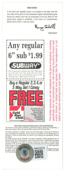 Deion Sanders Signed Cincinnati Reds 6/28/1997 vs Cardinals Ticket BAS 37208 The number in the listing title is just an inventory sku for our records and is not the authentication number. The item pictured is a stock photo unless otherwise noted. This is a authentic ticket stub that was personally autographed by Deion Sanders. Includes a certificate of authenticity from Beckett Authentication Services (BAS) and Denver Autographs.
