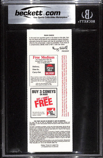 Deion Sanders Signed Cincinnati Reds 7/14/94 Slab Ticket Grade 8 Beckett 38806 The number in the listing title is just an inventory sku for our records and is not the authentication number. The item pictured is a stock photo unless otherwise noted. This is a Cincinnati Reds Slabbed Ticket Stub Grade 8 dated 07/14/1994 that was personally autographed by Deion Sanders. Includes a certificate of authenticity from Beckett Authentication Services (BAS) and Denver Autographs.