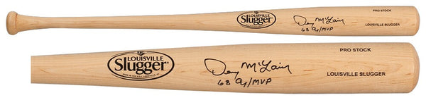 Denny McLain signed Louisville Slugger Pro Stock blonde baseball bat with '68 AL Cy, MVP' inscription. Item comes with a Schwartz Sports Memorabilia tamper-proof numbered hologram and Certificate of Authenticity which can be verified online.