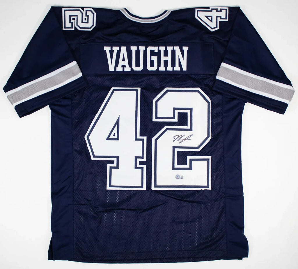 Custom on-field style jersey. Everything is sewn on, size adult XL. Hand-signed by Deuce Vaughn.The autograph includes an official Beckett Authentication Services serially numbered hologram and QR Code Card for authenticity purposes. The signing of this item was witnessed by Beckett.Authentication: Beckett Hologram with QR Code CardCustom on-field style jerseys are a more affordable option for autograph seekers. These jerseys do not have any brand name or tags and are made in the Philippines. They feature stitched on names and numbers and are made to look very similar to the on-field jerseys that the players wear. These custom jerseys are very commonly used in the memorabilia industry.