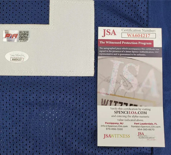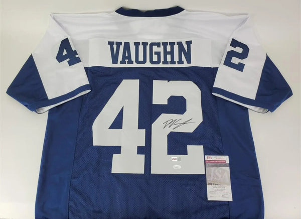 This autographed Custom on-Field Style Adult XL jersey has been personally hand-signed by Deuce Vaughn of the Dallas Cowboys. The autograph(s) includes an official James Spence Authentication (JSA) hologram and matching COA for authenticity purposes. The signing of this item was witnessed by JSA.Authentication: JSA COA Custom on-field style jerseys are a more affordable option for autograph seekers. These jerseys do not have any brand name or tags and are made in the Philippines. They feature stitched on names and numbers and are made to look very similar to the on-field jerseys that the players wear. These custom jerseys are very commonly used in the memorabilia industry.