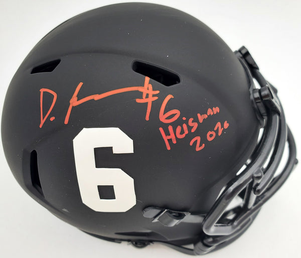 This is an Alabama Crimson Tide Eclipse Black Speed Mini Helmet that has been hand signed by Devonta Smith. The Eclipse Black helmets are very delicate and often have some marks or scratches on them. This item was inscribed "Heisman 2020." This item has been certified authentic by Beckett Authentication (BAS) and comes with their tamper-proof sticker and matching certificate of authenticity.