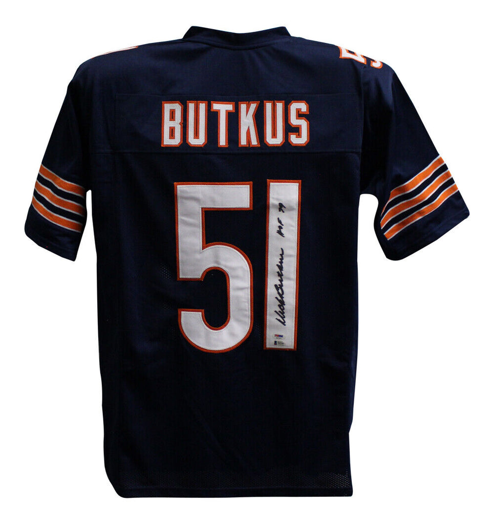 The number in the listing title is just an inventory sku for our records and is not the authentication number. The item pictured is a stock photo unless otherwise noted. This is a pro style blue jersey with sewn on numbers that was personally autographed by Dick Butkus with "HOF" inscription. Includes a certificate of authenticity from Beckett Authentication Services (BAS) and Denver Autographs.FREE SHIPPING within the USA on orders over $10!