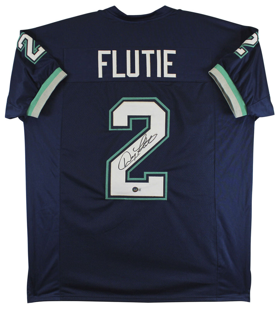 This Autographed Navy Blue Pro Style Jersey has been Personally Signed by Doug Flutie. This item is 100% Authentic to include a hologram by Beckett Authentication Services. This item will come with the new Beckett Authentication hologram that has a scannable QR code rather than the traditional COA. If you would like to have a COA, you are welcome to reach out to Beckett for a printed certification once you receive your item. This is a BAS Witnessed Protection Program item which means a Beckett Authentication Service representative was present when this item was being signed. We conducted an autograph signing with Doug Flutie where multiples of the same item were signed. While the photographs are representative of this item, the size, placement and strength of the signature may vary. Each item is hand signed, therefore, each autograph is unique. This item can be verified through BAS Witnessed. This is a X-Large sized, non-branded, custom-stitched Jersey.