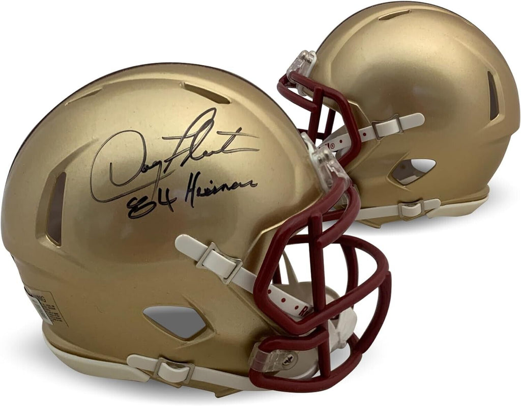 Doug Flutie has autographed this Boston College mini helmet and written 84 HEISMAN. Autograph is authenticated by Beckett Authentication Services (BAS) who was present for the signing with him and witnessed him signing your item. Simply scan the QR code on your item to verify.
