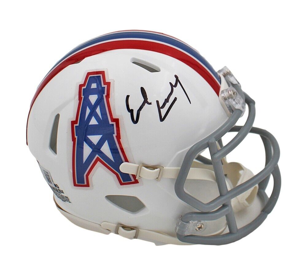 A Houston Oilers Speed Throwback NFL Mini Helmet hand signed by Earl Campbell. The item and signature are in excellent condition. Earl is a former NFL running back playing for eight seasons in the NFL. He was the NFL MVP (1979), 3x NFL Offensive Player of the Year, NFL Offensive Rookie of the Year (1978), and selected for the Pro Bowl 5x. He was inducted into the Pro Football Hall of Fame in 1991. AUTHENTICATION: The item is accompanied by a Beckett Serial Numbered and Databased Hologram.