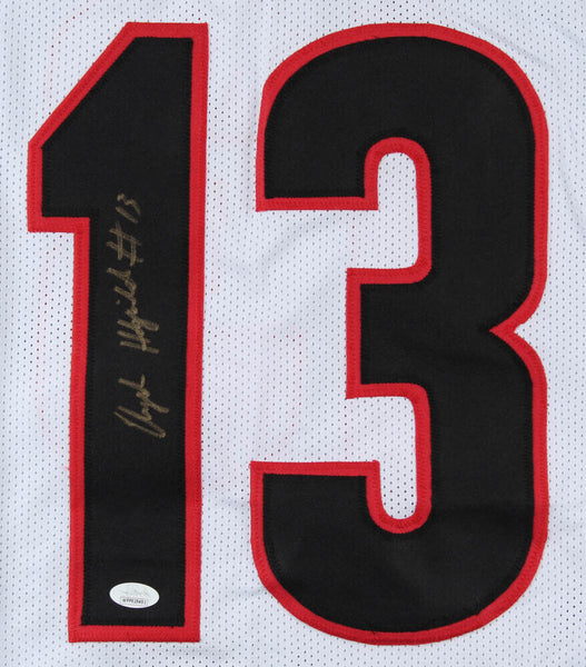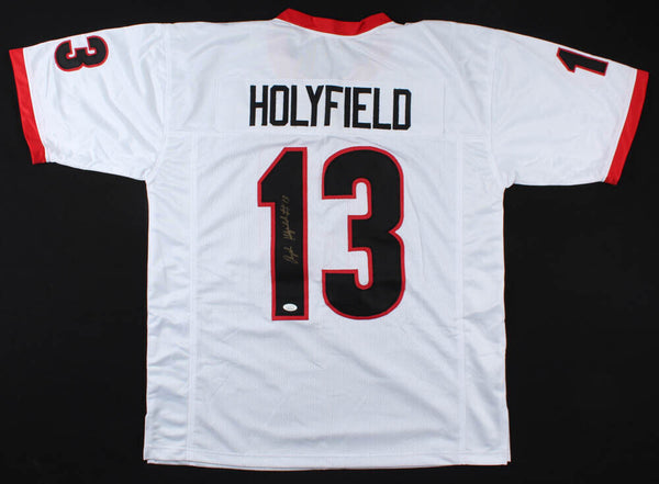 Custom on-field style jersey. Everything sewn on, size XL. Hand-signed by Elijah Holyfield. The lot / autograph(s) includes an official James Spence Authentication (JSA) hologram for authenticity purposes. The signing of this item was witnessed by JSA.Authentication: JSA Hologram