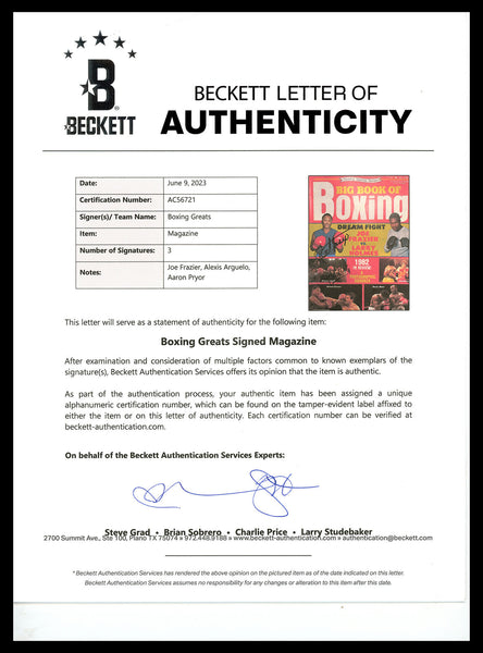 This is a Big Book of Boxing magazine that has been hand signed by Joe Frazier, Alexis Arguello & Aaron Pryor. This item has been certified authentic by Beckett Authentication (BAS) and comes with their Tamper-Proof Hologram and matching full-page certificate of authenticity.