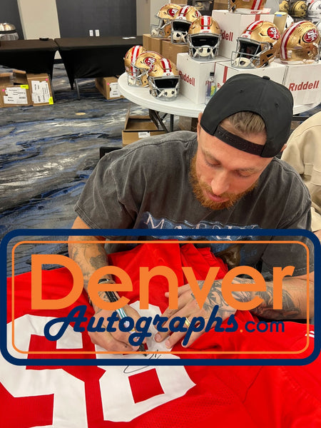 The number in the listing title is just an inventory sku for our records and is not the authentication number. The item pictured is a stock photo unless otherwise noted. This is a Pro Style Size XL Red Jersey with sewn on numbers that was personally autographed by George Kittle. Includes a certificate of authenticity from Beckett Authentication Services (BAS) and Denver Autographs.