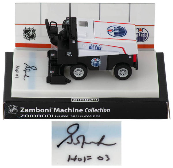 Grant Fuhr signed Edmonton Oilers NHL mini zamboni with 'HOF 03' inscription. Item comes with a Schwartz Sports Memorabilia tamper-proof numbered hologram and Certificate of Authenticity which can be verified online.